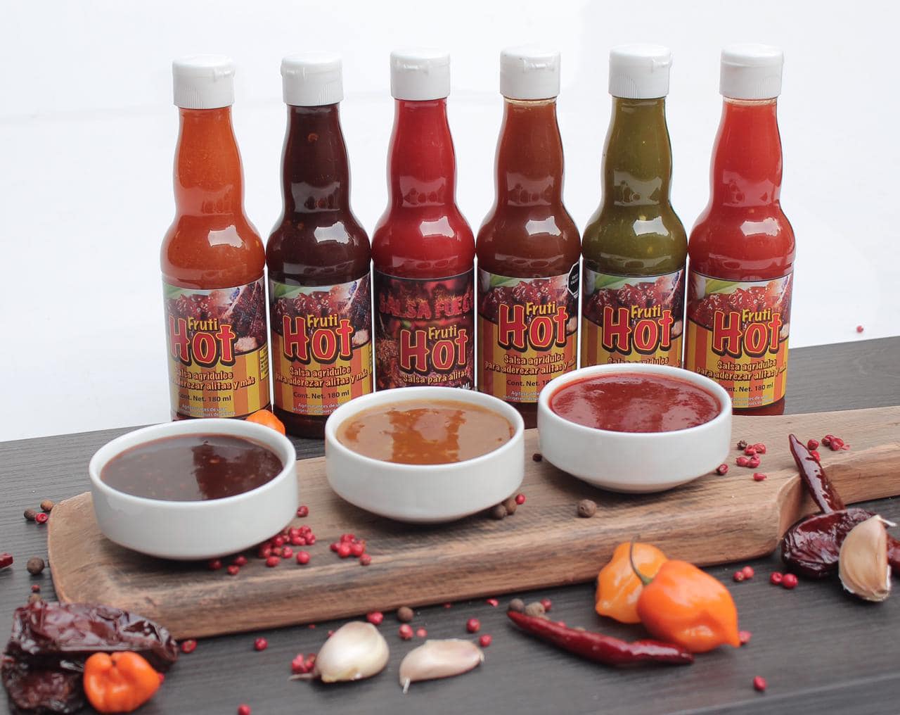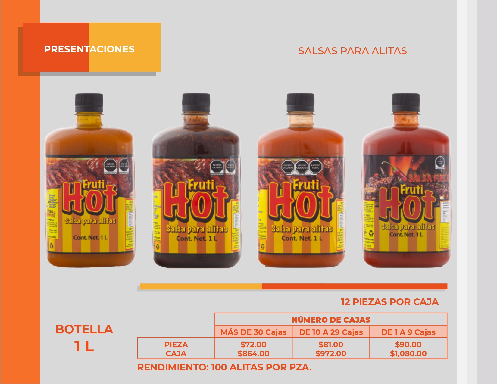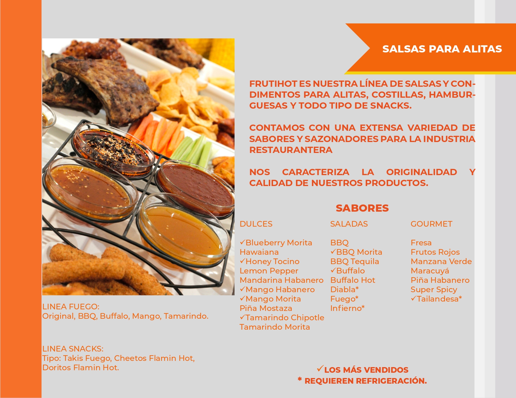 FRUTIHOT ES NUESTRA LÍNEA DE SALSAS Y CONDIMENTOS PARA ALITAS, COSTILLAS, HAMBURGUESAS Y